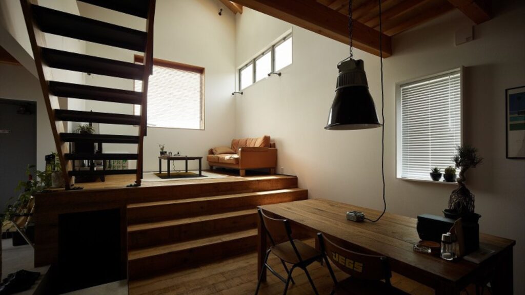 多くの施工事例で共通しているのが、開放感のあるLDKです。天井高を確保した空間に、無垢材の床、アイアン階段、ハイサイド窓から入る自然光。これらが重なることで、工場跡地のロフトのような空間が生まれます。